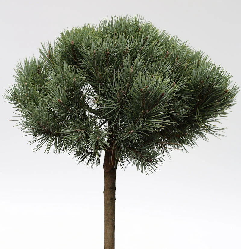 Die Silberkiefer wurde auf Hochstamm veredelt. Die Benadelung ist silberblau. Die Silberkiefer duftet intensiv nach Kiefer. Die Pflanze benötigt einen trockenen mit leicht feuchtem Gartenboden, der gerne auch etwas sauer sein darf. Ihr Standort sollte sonnig bis halbschattig sein. Die Silberkiefer ist eine winterharte und auch wintergrüne Pflanze.